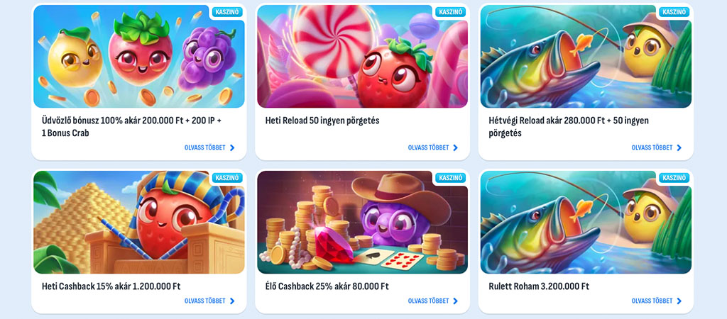 A Cseresznyével 100%-os bónuszt kaphatsz akár 150.000 Ft-ig + 200 ingyen pörgetést és 1 Bonus Crab-et. Jó választás, ha nehezen tudsz választani a bőség zavara miatt.