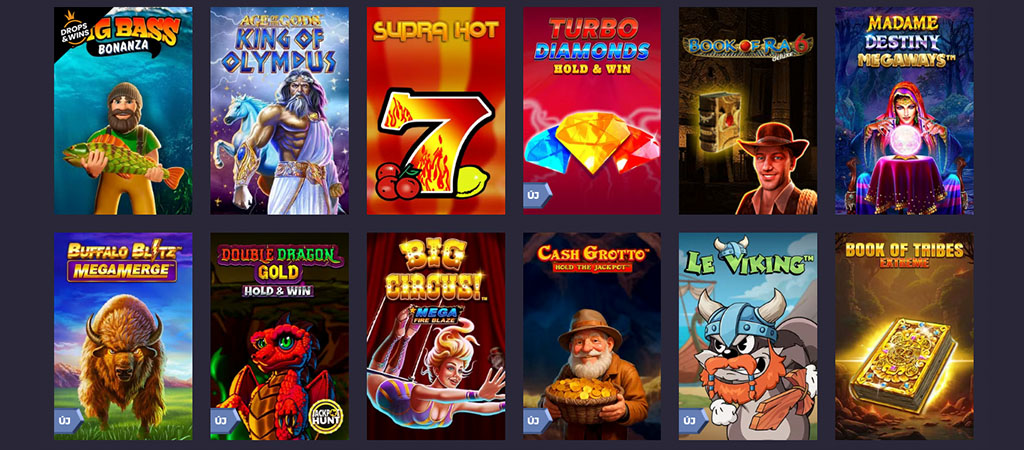 A kaszinó szekcióban olyan népszerű játékokra bukkanhatsz, mint a Cash of Gods (ELA Games), The Crypt (NoLimit City), Big Bass Amazon Xtreme (Pragmatic Play), Book of Rampage (Spinominal), Golden Realms (NetENT), White Wolf Moon (Microgaming), Fruity Megaways (Iron Dog Studios), DJ Cat (Push Gaming), Feasting Fox (Quickspin), Shrine of Anubis Gold Hit (Playtech), Rainforest Gold (Red Tiger Gaming), Rich Raptors (Relax Gaming), Sizzling 777 Deluxe (Wazdan), Sword of Shoguns (Thunderkick), 20 Ember Wilds (Gamomat) és még sok más zseniális játékra.